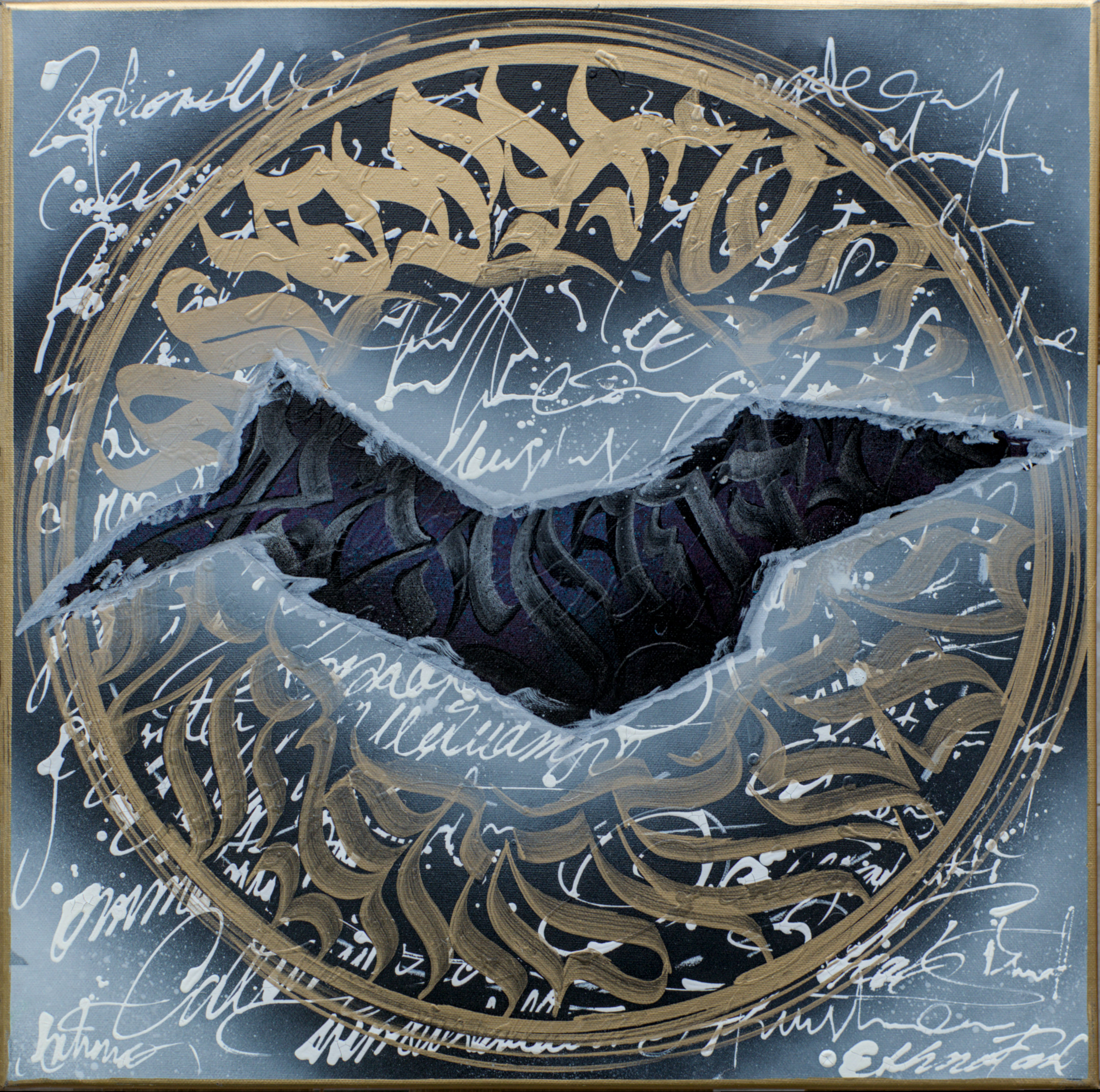 Die Idee hinter diesem Werk war es, zwei scheinbare Gegensätze zu vereinen: das Edle und das „Dirty“. Der Begriff „Dirty“ wird in der Kalligraphie-Szene verwendet, um eine gewisse Rohheit und Ursprünglichkeit zu beschreiben – eine Ästhetik, die perfekt zum Wesen der Peyote-Pflanze passt. Die goldenen und weißen Elemente symbolisieren ihre spirituelle und göttliche Kraft, während der Riss und die raue Gestaltung die Widerstandsfähigkeit und Härte der Pflanze würdigen.