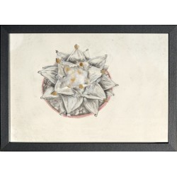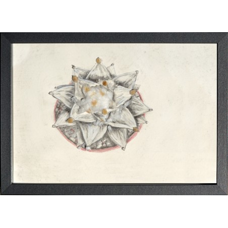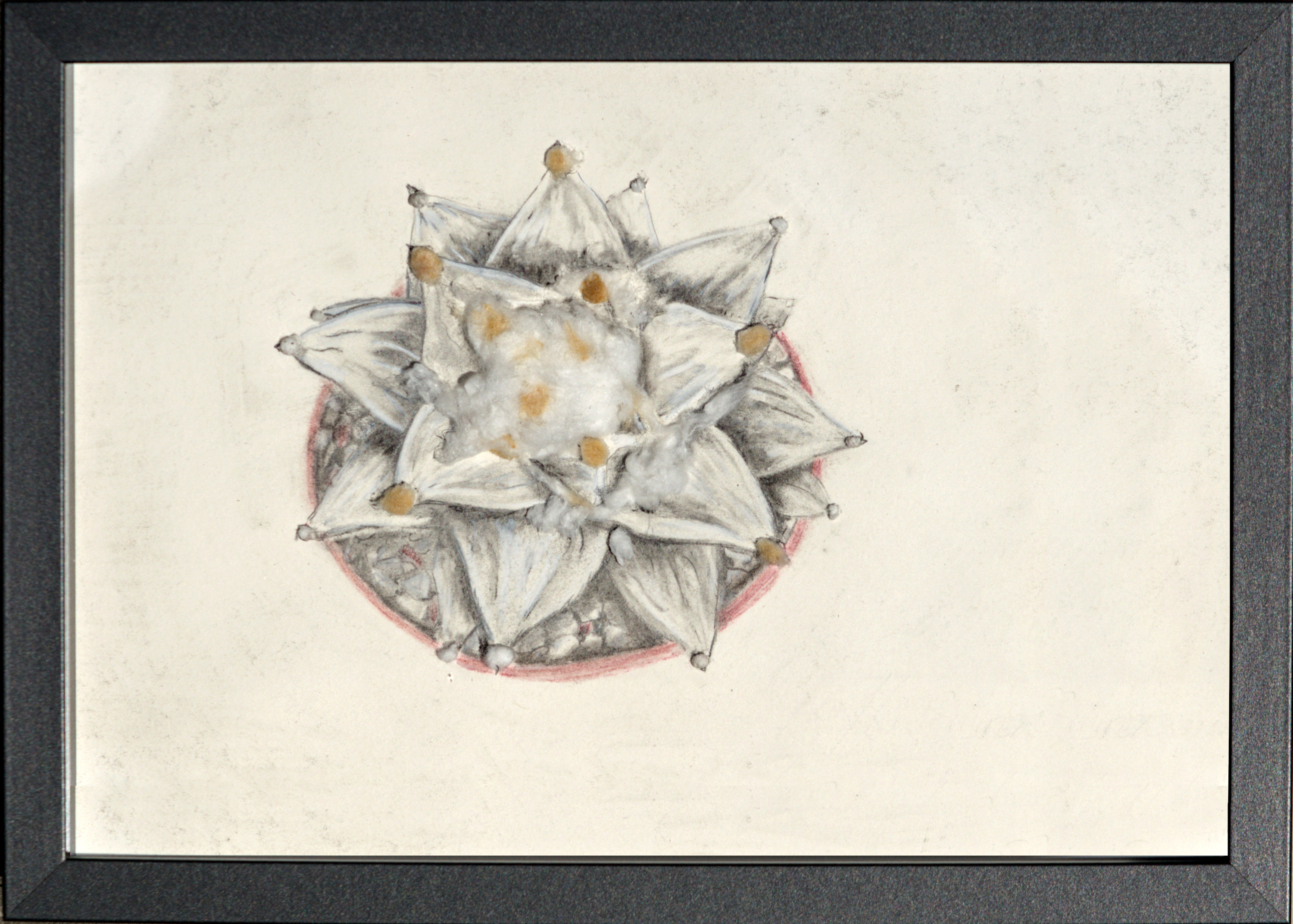 Diese beeindruckende Darstellung eines Ariocarpus vereint traditionelle Zeichentechniken mit experimentellen Materialien und schafft so eine außergewöhnliche dreidimensionale Wirkung. Die detailreiche Bleistiftzeichnung bildet die Grundlage des Kunstwerks und verleiht den Blättern des Kaktus eine realistische Textur und Tiefe. Der gezielte Einsatz von Watte als künstlerisches Element betont die zarte, fast flauschige Erscheinung der Areolen- und Scheitelwolle und fügt dem Bild eine haptische Dimension hinzu.