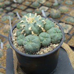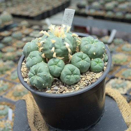 Dieser Lophophora ist pflegeleicht und bevorzugt einen sonnigen und warmen Standort. Wie die meisten Kakteen benötigt er nur mäßige Wassergaben und eine gut durchlässige Erde, um Wurzelfäule zu vermeiden.